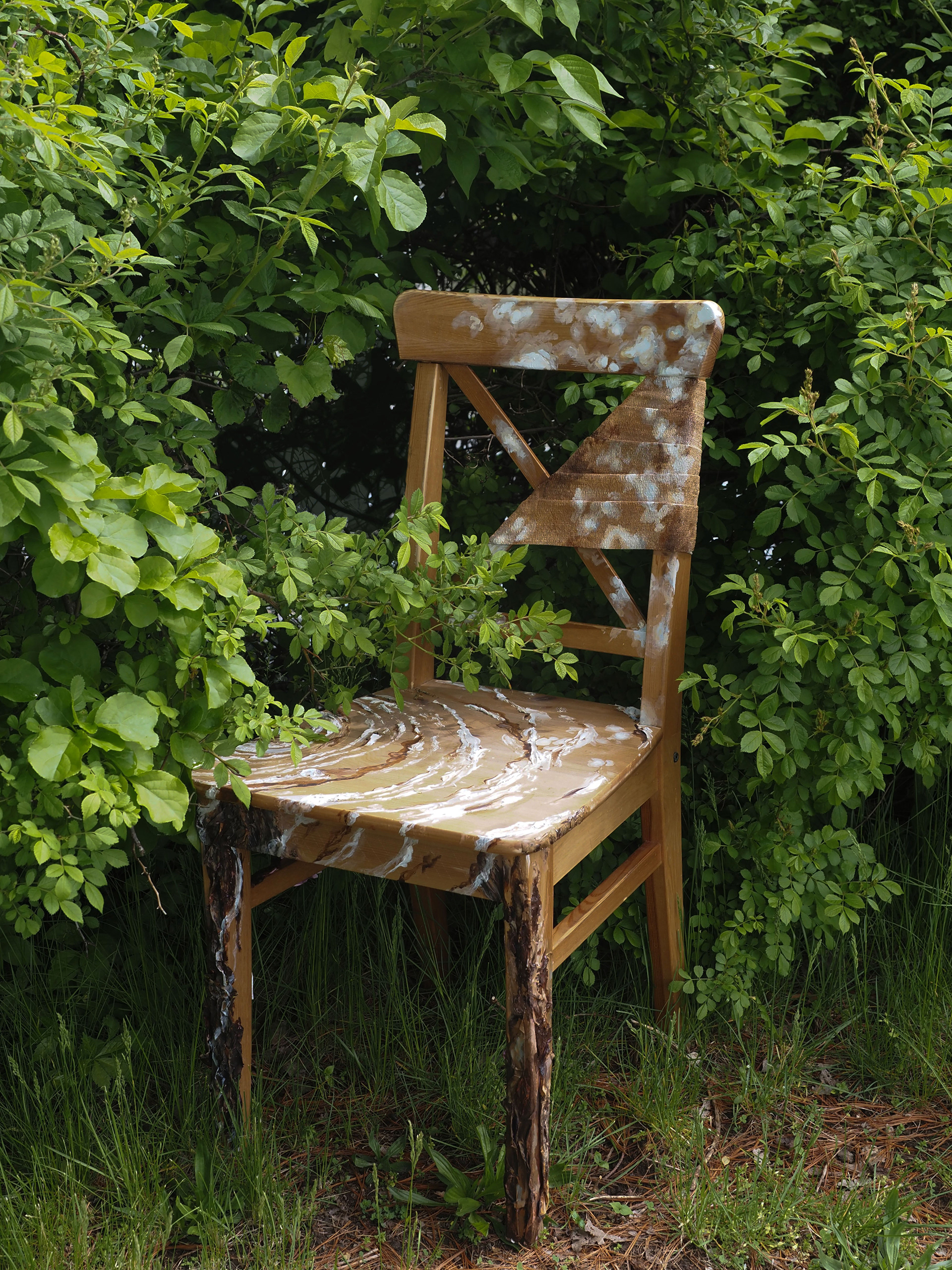 In studying how wooden surfaces interact with various mediums, I chose to revert a broken wooden chair to its “original” form — a tree. Using modeling paste and a palette knife, I gradually built up the texture of tree rings on the chair’s seat. I explored the technique of decoupaging, or layering wet paper, to mimic the roughness of a tree’s bark on the legs of the chair. Finally, I bandaged the broken back of the chair and painted the bandage with patterns resembling sun rays filtering through leaves. This transformation reflects the healing process: after trauma, the body rebuilds itself, layer by layer. Though it may not fully return to its original state, it endures, displaying a unique beauty born from resilience.